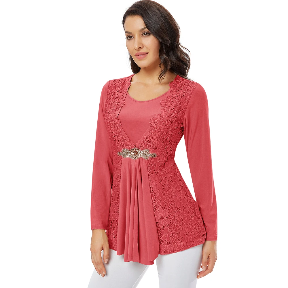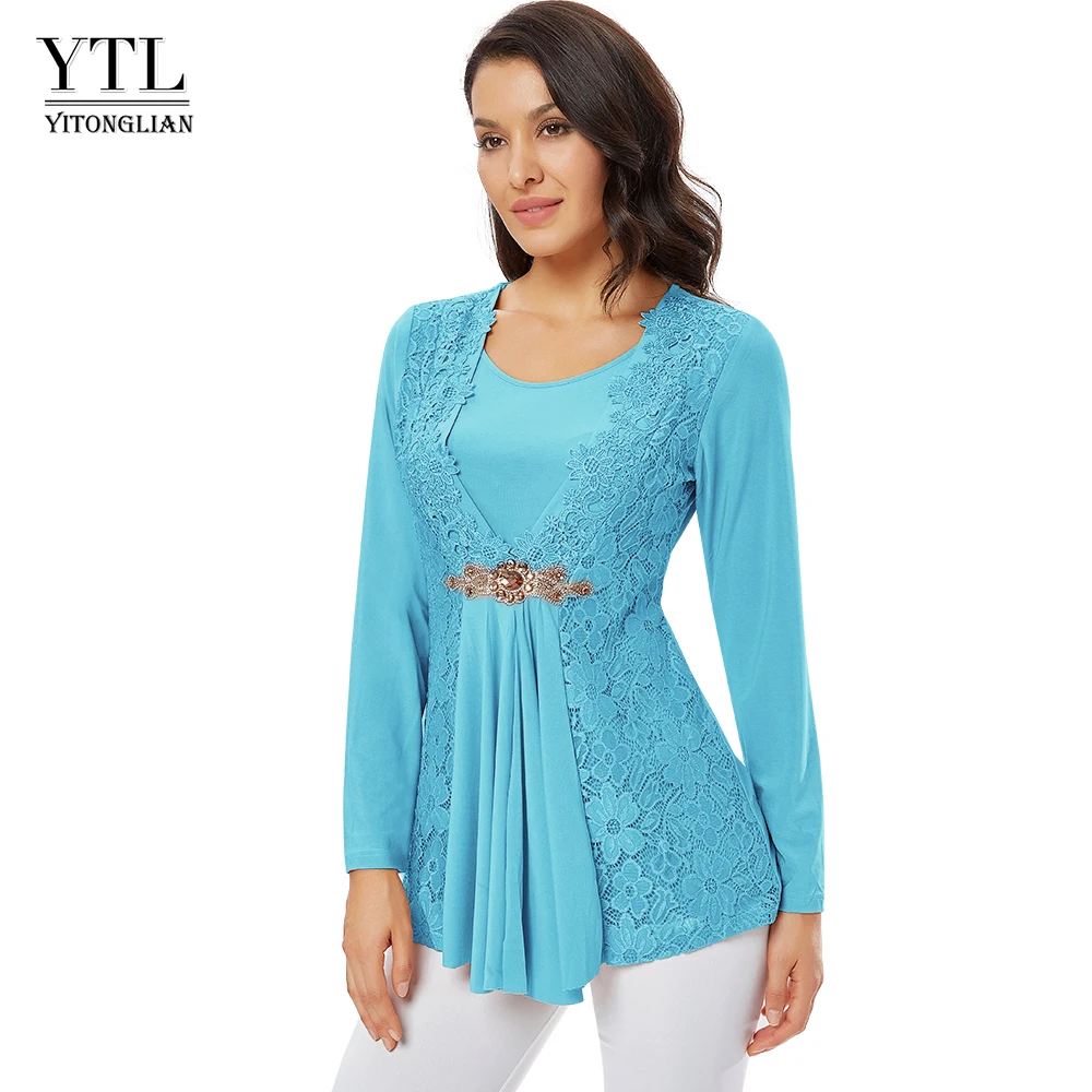YTL Ladies Golden Diamond Waist Decoration Slim Tunic Tops Casual Party Long Sleeve Women Elegant Lace Floral Blouse Shirt H025G
