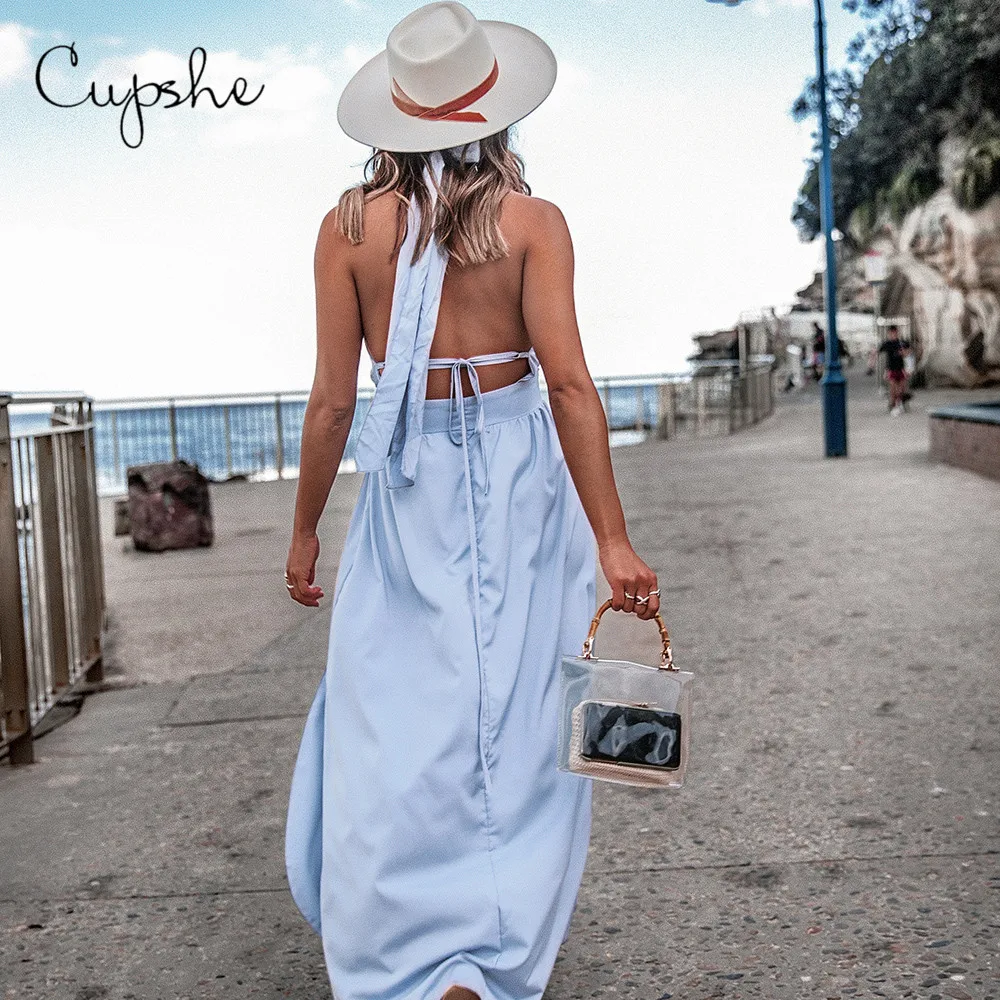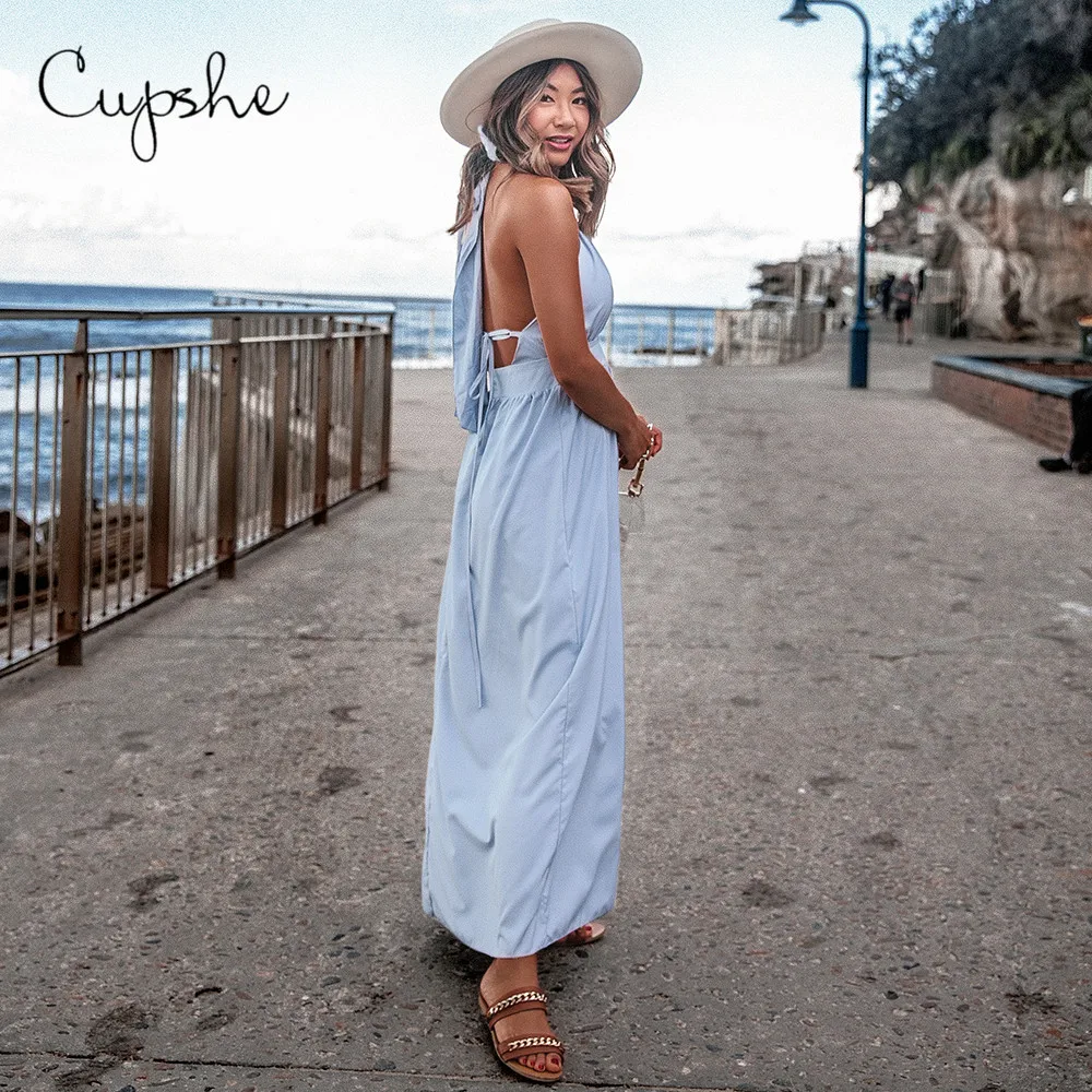 CUPSHE Blue Backless Maxi Dress Woman Sexy Deep V-neck Lace Up Long Halter Dresses 2019 Beach Summer Sundress Spaghetti Vestido