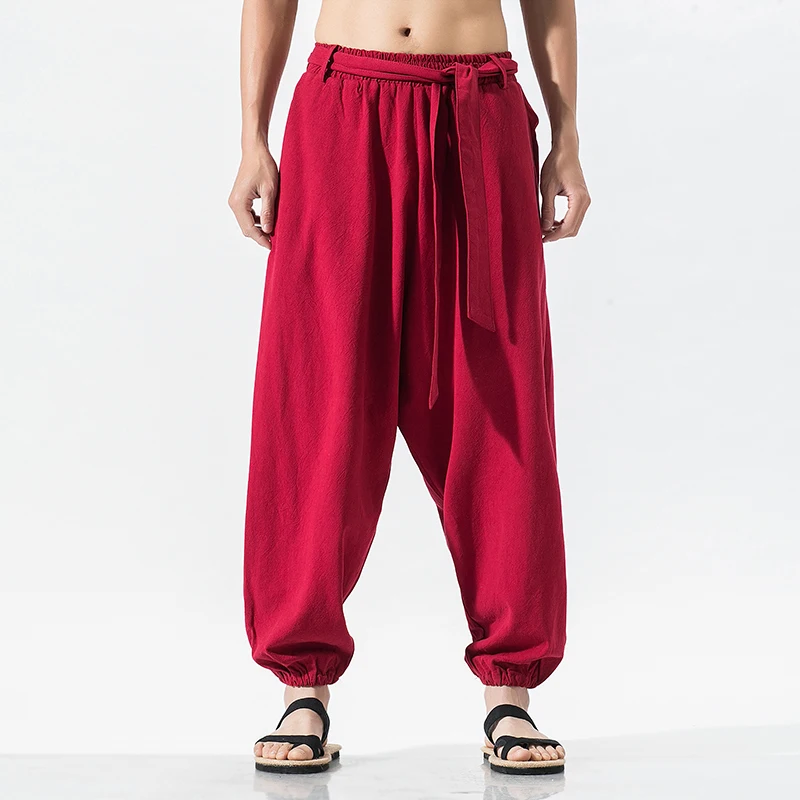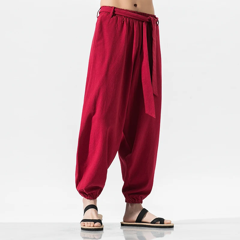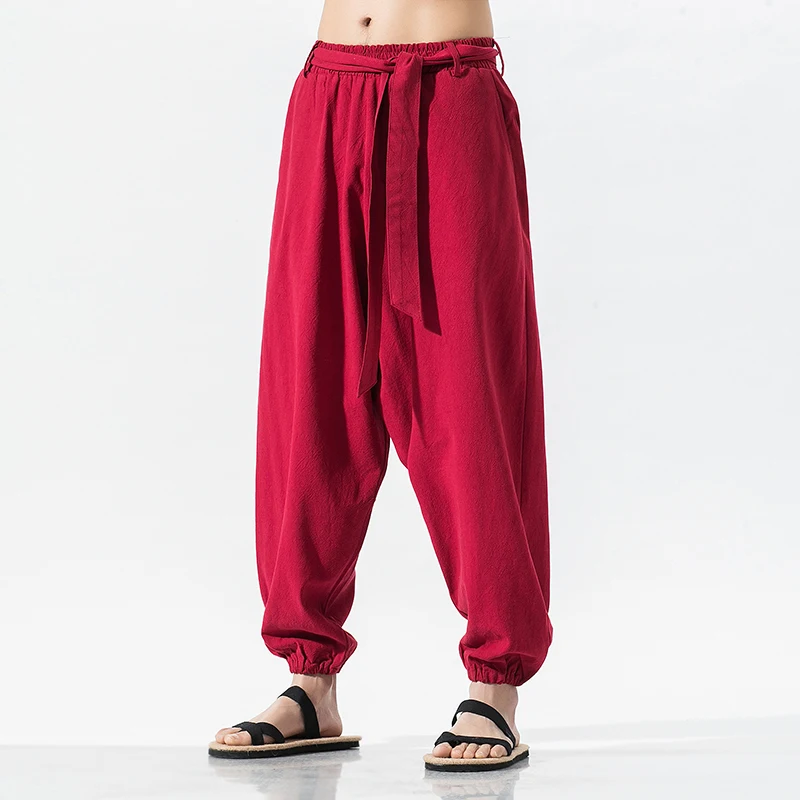 Addition Information of New 2020 Summer Wide Leg Pants Men Cotton Linen Bloom Pants Mens Red Chinese Style Harem Pants Male