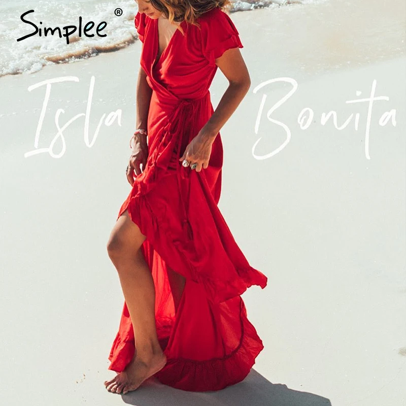 Special Price of Simplee V-neck ruffled boho dress Sexy cotton short sleeve holiday beach maxi dress Casual solid ye